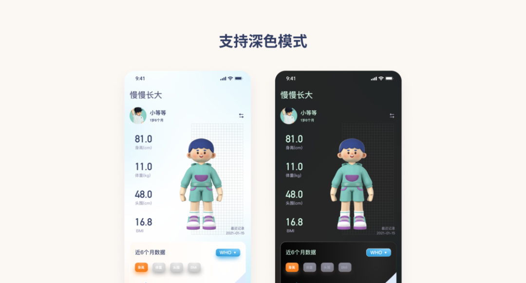 作为家长,白天的时候为了更好的陪伴孩子,很多事情就被动安排在了孩子熄灯睡觉以后,考虑到这种情况,我们的 app 也支持深色模式,在保证不过多干扰眼睛的情况下,也会给你另一番的视觉体验。