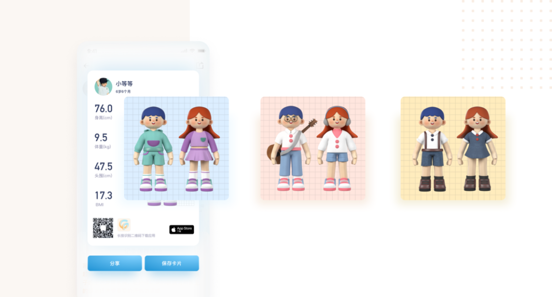 孩子的每一次成长,作为家长都会想要与人分享喜悦,所以我们做了这个功能,在家长每次记录孩子的数据后,都可以选择分享此次数据,做成卡片式,在满足美观的同时,也可以更方便家长储存和分享孩子的成长数据。