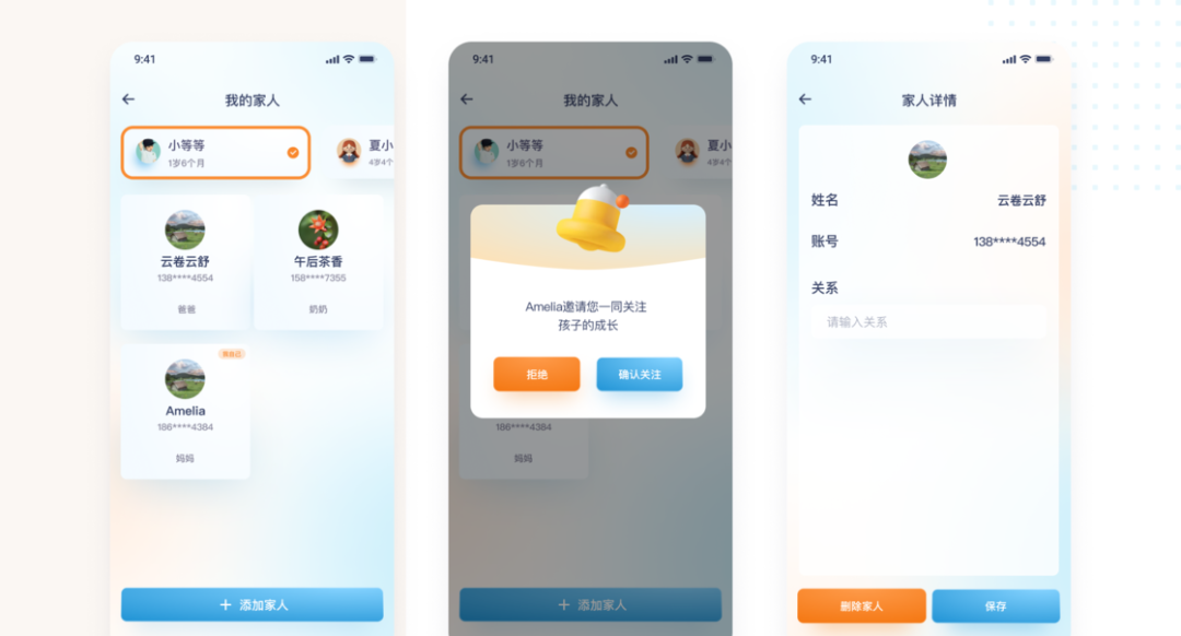 我们深知孩子的成长牵动着每一个家庭成员的心,所以我们做了「我的家人」功能,可以邀请家庭成员共同关注和记录孩子的成长数据,让每一个家庭成员都不错过孩子长大过程中的点点滴滴。