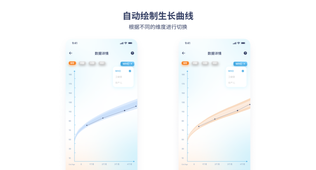 我们会根据家长记录下的成长数据,自动连接数值,绘制出孩子身高、体重、头围以及经过计算的BMI生长曲线。我们选取由 WHO 制定的儿童生长标准,以供家长更好地参考孩子所处的生长标准,未来我们还会引入更多的标准供家长选择参考。