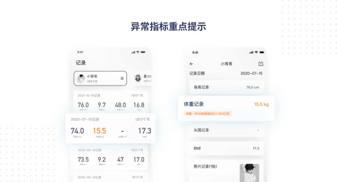 如果孩子的某一项生长发育不在儿童生长的参考标准内,那么我们会在记录列表里做出特别提示,然后在详情里面提示家长正常的数据范围,以便于家长可以对异常指标进行额外的关注。