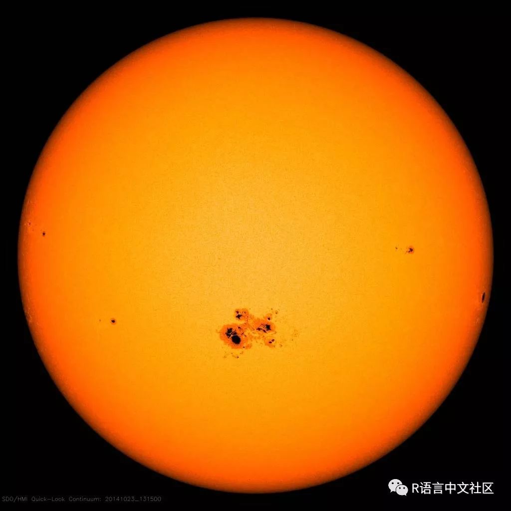 太阳黑子是随 R 发布的著名数据集(参见 datasets 包)。数据集跟踪记录太阳黑子,即太阳表面出现黑点的事件。这是来自 NASA 的一张照片,显示了太阳黑子现象。相当酷!