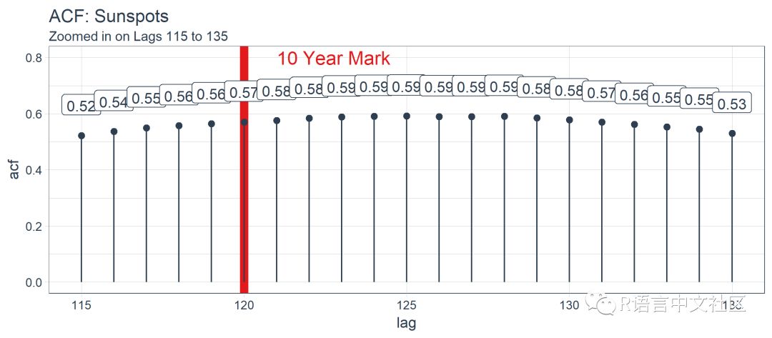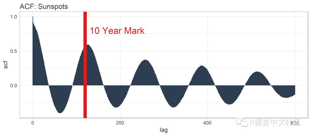 首先,我们需要回顾自相关函数(Autocorrelation Function,ACF),它表示时间序列与自身滞后项之间的相关性。stats 包库中的 acf() 函数以曲线的形式返回每个滞后阶数的 ACF 值。但是,我们希望将 ACF 值提取出来以便研究。为此,我们将创建一个自定义函数 tidy_acf(),以 tidy tibble 的形式返回 ACF 值。