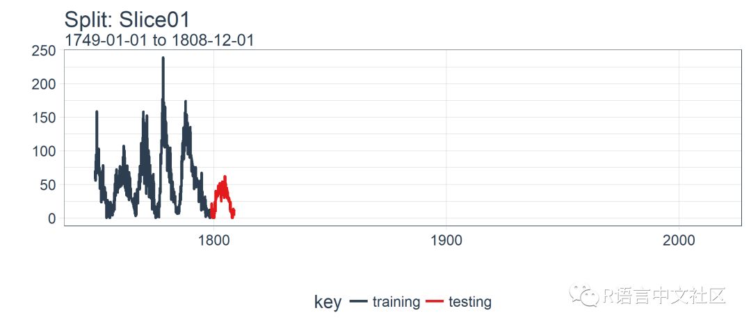 我们可以用两个自定义函数来可视化再抽样。首先是 plot_split(),使用 ggplot2 绘制一个再抽样分割图。请注意,expand_y_axis 参数默认将日期范围扩展成整个 sun_spots 数据集的日期范围。当我们将所有的图形同时可视化时,这将变得有用。