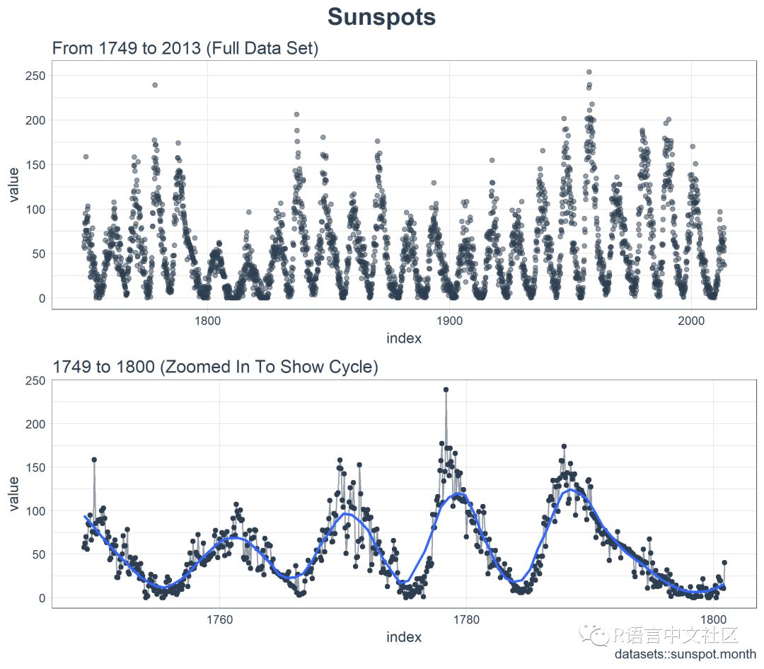 COWPLOT 可视化太阳黑子数据我们将创建若干 ggplot 对象并借助 cowplot::plot_grid() 把这些对象组合起来。对于需要缩放的部分,我们使用 tibbletime::time_filter(),可以方便的实现基于时间的过滤。