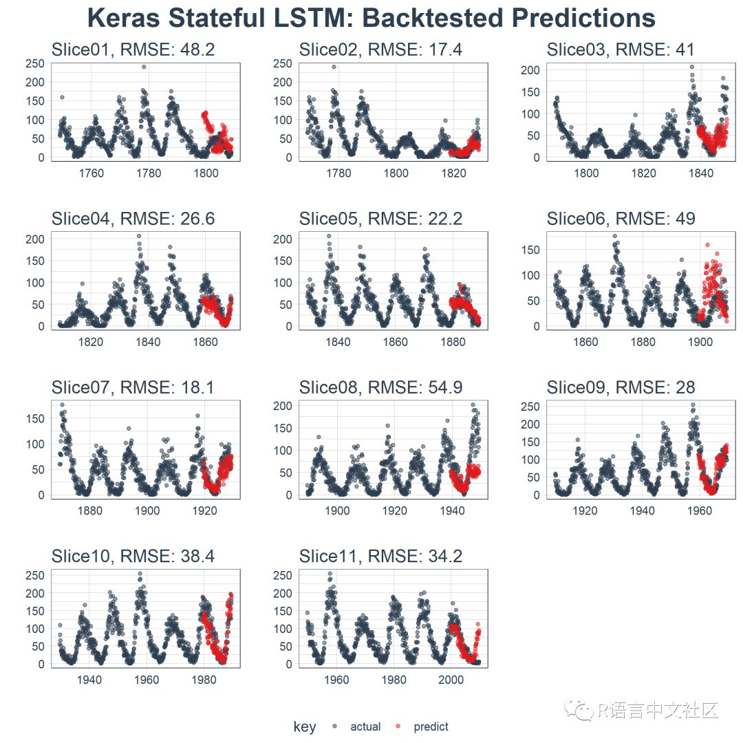 当在太阳黑子数据集上测试 LSTM 模型准确性时,我们将使用这种回测策略(来自一个时间序列的 11 个样本,每个时间序列分为 50/10 两部分,并且样本之间有 20 年的偏移)。