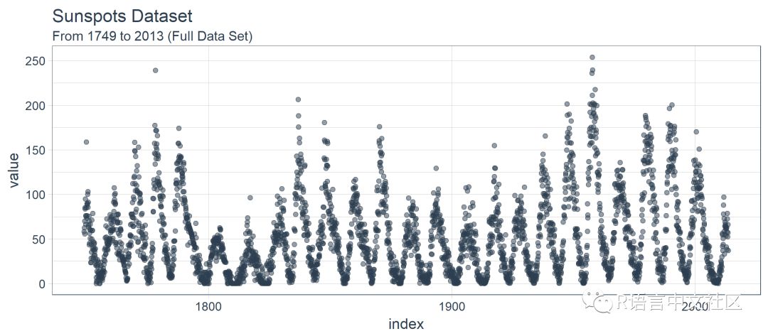 数据集 sunspot.month 随 R 一起发布,可以轻易获得。它是一个 ts 类对象(非 tidy 类),所以我们将使用 timetk 中的 tk_tbl() 函数转换为 tidy 数据集。我们使用这个函数而不是来自 tibble 的 as.tibble(),用来自动将时间序列索引保存为zoo yearmon 索引。最后,我们将使用 lubridate::as_date()(使用 tidyquant 时加载)将 zoo 索引转换为日期,然后转换为 tbl_time 对象以使时间序列操作起来更容易。
