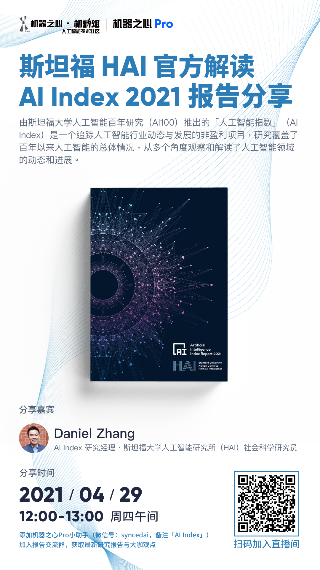 此外,机器之心还邀请到了 AI Index 研究经理 Daniel Zhang,通过直播的方式与国内 AI 从业者交流、探讨 AI 趋势,欢迎大家报名参与。