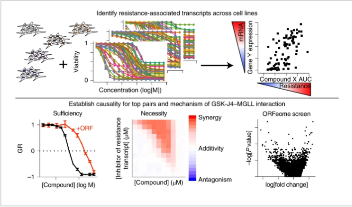 作者假设癌细胞系的基础基因转录状态,再加上小分子的细胞活性谱,可用于确定内在抗性的特定机制并预测克服抗性的药物组合,作者分析了 564,424 个敏感性数据谱来识别候选基因-化合物对,并验证了九个这样的关系。