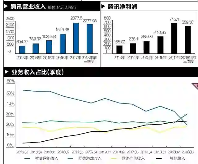 互联网分析师尹生分析,2015年第四季度,腾讯游戏业务收入占比超过50%,但2016年第一季度成为转折点,因为腾讯开始对部分微信交易收取服务费,主要包含腾讯金融科技与云服务的“其他”收入, 在此后两年便以100%以上的高速增长,取代游戏成为第一大的增长贡献者 。2018年第三季 ,财报中“ 其他收入”仍有超过69%的同比增长。不仅在公司四大业务板块中营收同比增速最快,并且营业收入占比达到 25%,在2018年第二季度上升到了第二位。