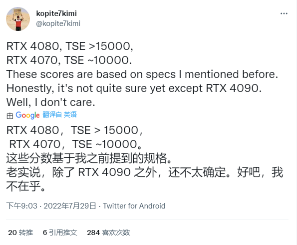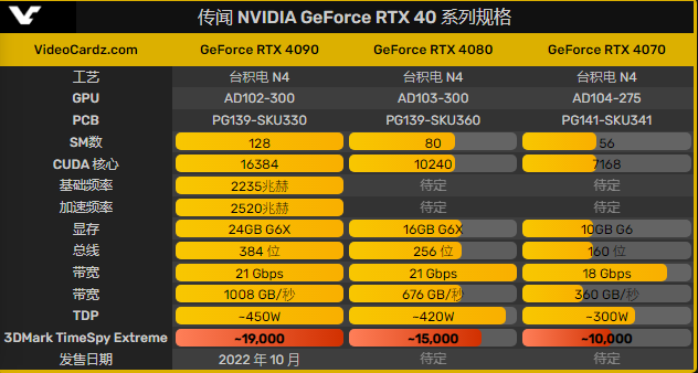 他表示这分数是基于他此前透露显卡的规格为前提的,也就是 RTX 4080 采用 AD103 GPU 的,拥有 10240 个 CUDA 单元,配备 256bit/16GB 的 GDDR6X 显存,显存带宽大概 676GB/s,TDP 大概 420W。而 RTX 4070 则采用 AD104 GPU,拥有 7168 个 CUDA 单元,配备 160bit/10GB GDDR6X 显存,显存带宽大概 360GB/s,TDP 大概 300W。