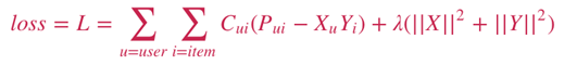其中P是一个二值化的矩阵,用来表达用户是否和物品有交互。C是confidence矩阵,由用户和物品的交互次数矩阵得到,次数越多相应的值越大,用来表达用户对物品的感兴趣程度。