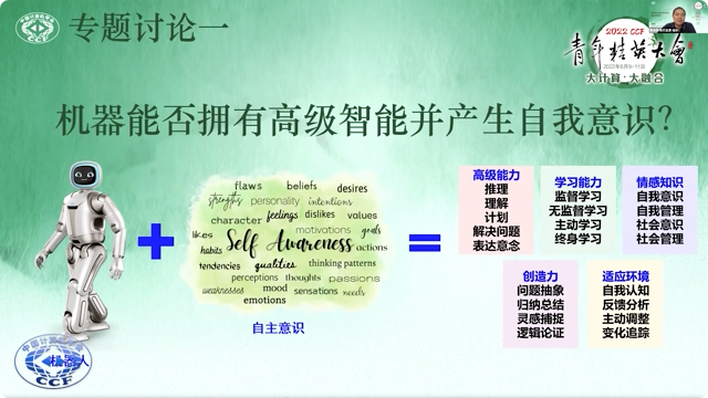 CCF YEF 2022于2022年6月9-11日在北京、苏州等城市线上线下联动举办,期间举办了“服务机器人的自主意识与高级智能能否实现?”专题论坛。