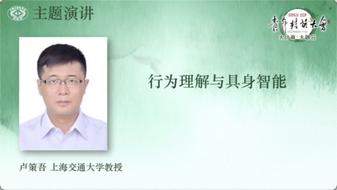 第三位嘉宾是来自上海交通大学的卢策吾教授,演讲题目是“行为理解与具身智能”。该报告围绕人工智能中的行为理解问题展开讨论,从机器认知角度探讨如何让机器学会“看懂”行为。