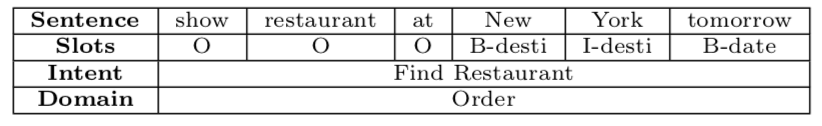 给定一句话,自然语言理解将其映射到语义槽中。这些槽都是根据不同场景预设而成。表1展示一个自然语言表示的例子,其中“New York”是一个语义槽的值的位置,并且还确定了其领域和意图。通常我们需要进行两种类型的表示。第一种是句子级别的分类,例如用户意图和句子种类。第二种是词级别的信息抽取,例如命名实体识别和槽填充。