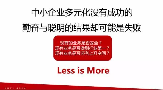 第一个问题,你现有的业务是不是足够安全的?很多企业的第一个业务还在半坡爬的时候,还有很多竞争对手的时候,还有死亡危险的时候就开始搞新的业务,这肯定是不对的。