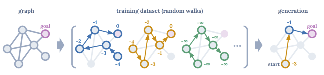 如下图所示,图左为强化学习为固定图寻找最短路径,图中显示由随机游走轨迹和每个节点的返回组成的训练数据集,图右显示了以起始状态和每个节点产生的最大可能回报为条件,Decision Transformer 对最佳路径进行了排序。