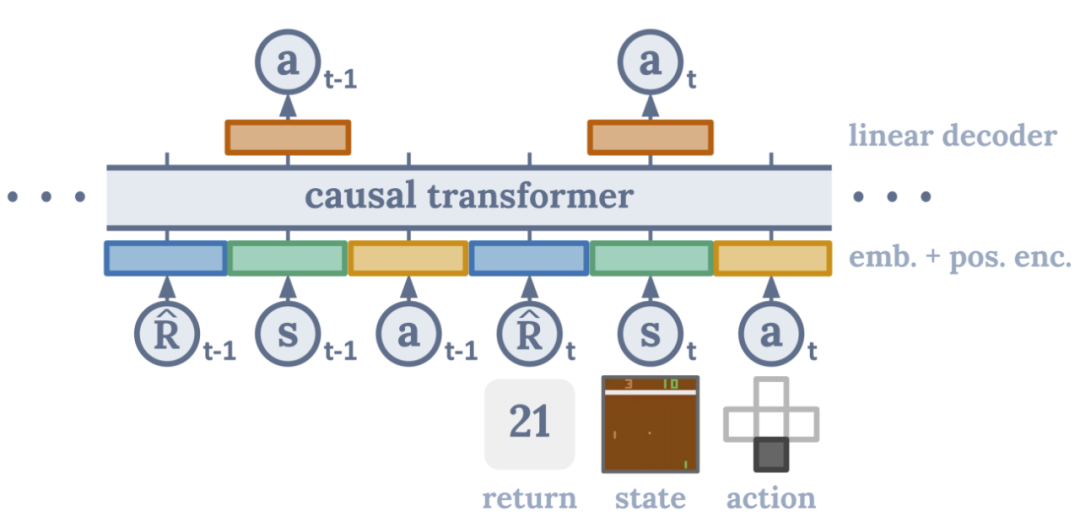 研究者采用了一种简单的方法:每个模态(返回、状态或动作)都被传递到一个嵌入网络(图像的卷积编码器和连续状态的线性层),然后嵌入通过自回归 Transformer 模型处理,在给定先前 token 的情况下,使用线性输出层进行训练以预测下一个动作。