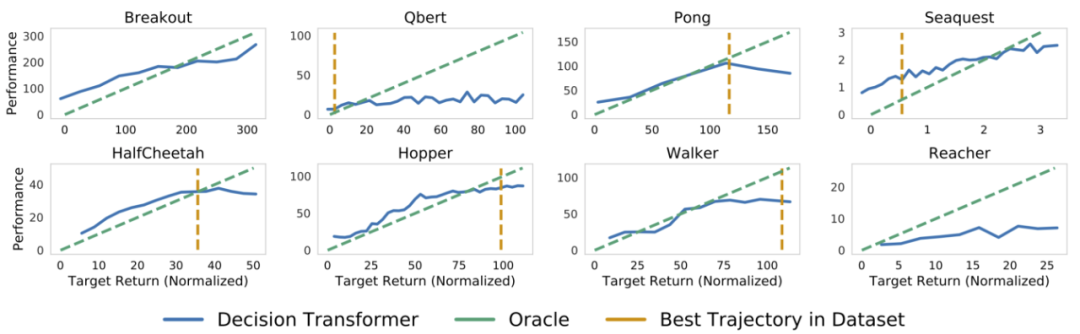 在 Pong、HalfCheetah 和 Walker 等一些任务上,Decision Transformer 生成的轨迹几乎完美匹配所需的回报(如图中与 oracle 线重叠所示)。此外,在诸如 Seaquest 之类的一些 Atari 任务中,Decision Transformer 有时能够进行外推。
