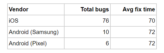 最后,这份报告还分析了开发者修复移动操作系统中的安全漏洞所花费的时间。尽管面临更多安全威胁,苹果 iOS 比谷歌安卓系统发布补丁的速度更快。