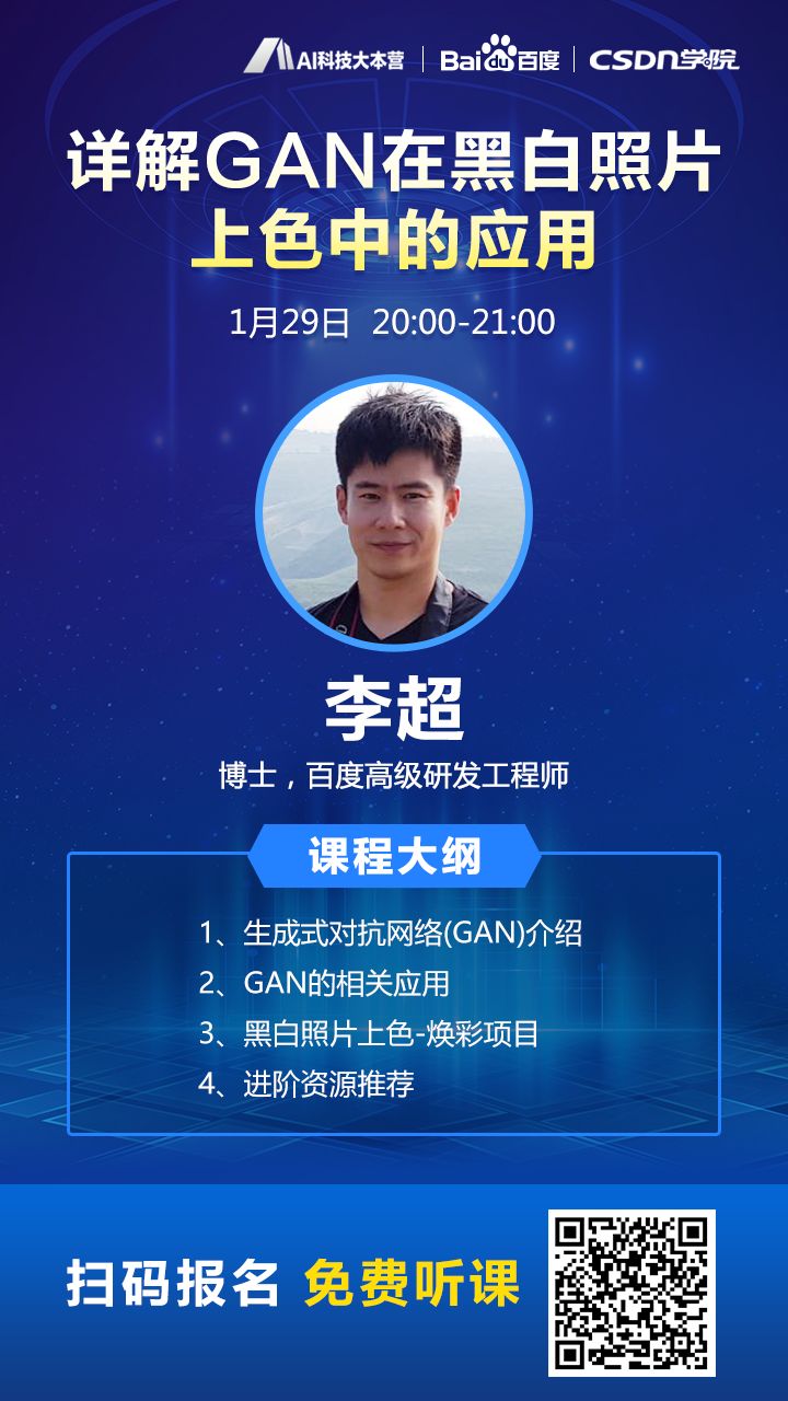 如何用AI技术为黑白老照片上色?本次公开课中,百度高级研发工程师李超将讲述对抗生成网络相关,学术界的研究现状和应用场景,以及GAN在百度视觉+百度PR+新华社合作的焕彩项目中的应用。