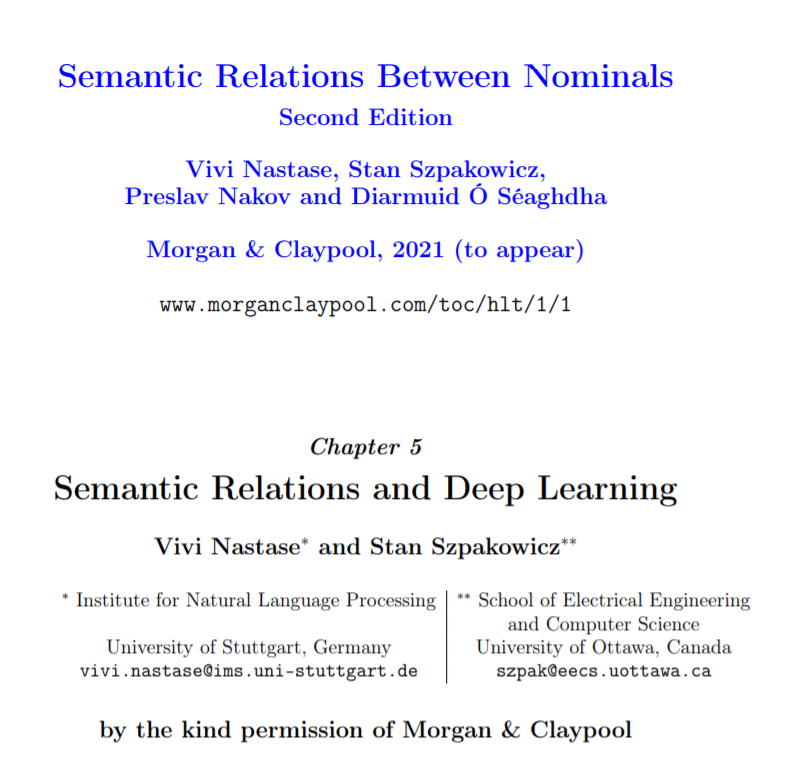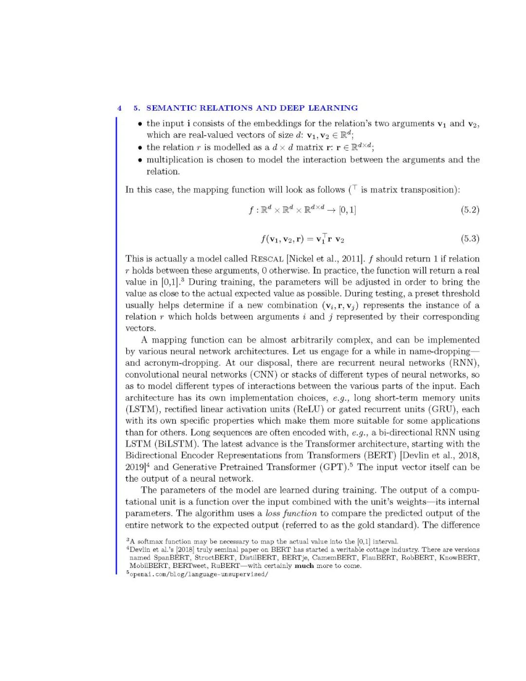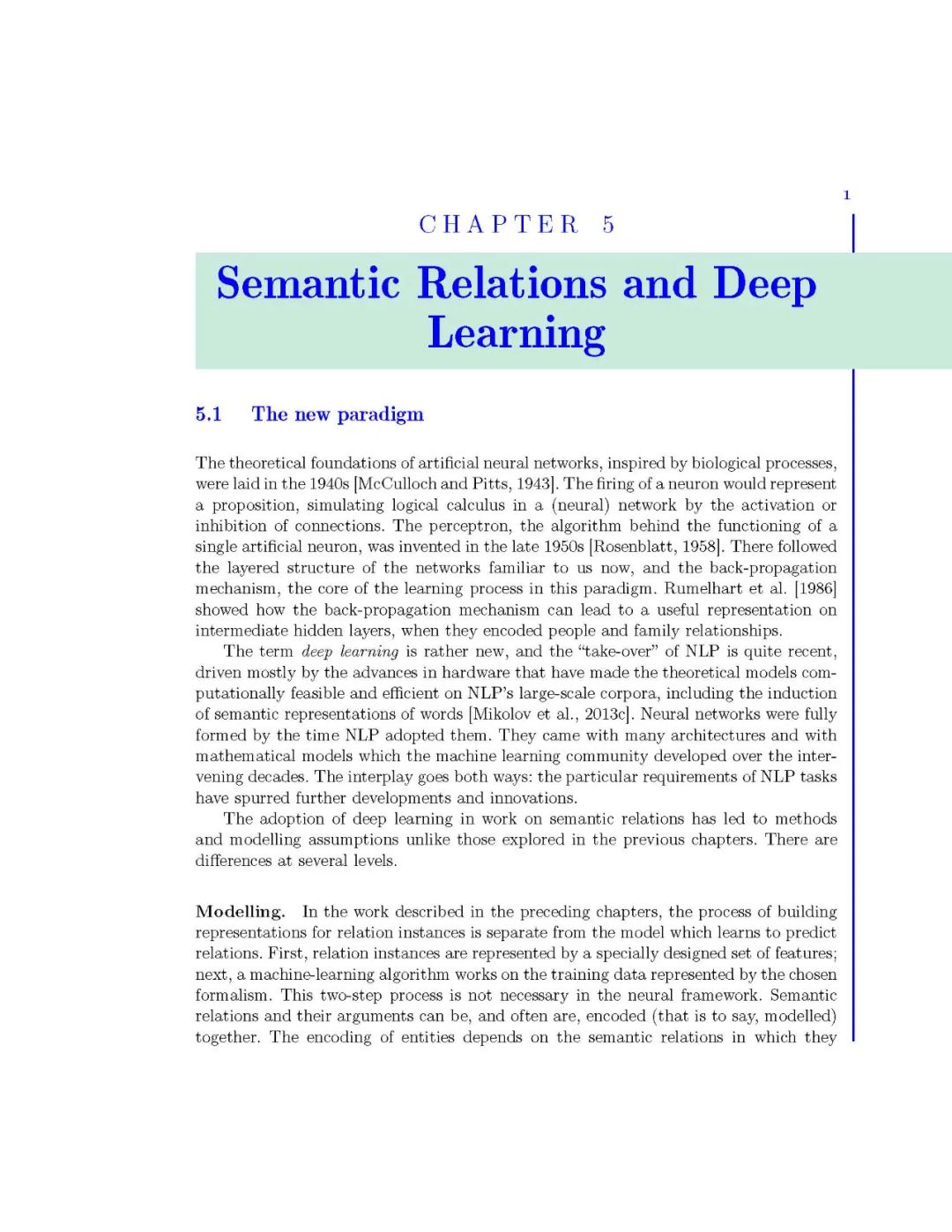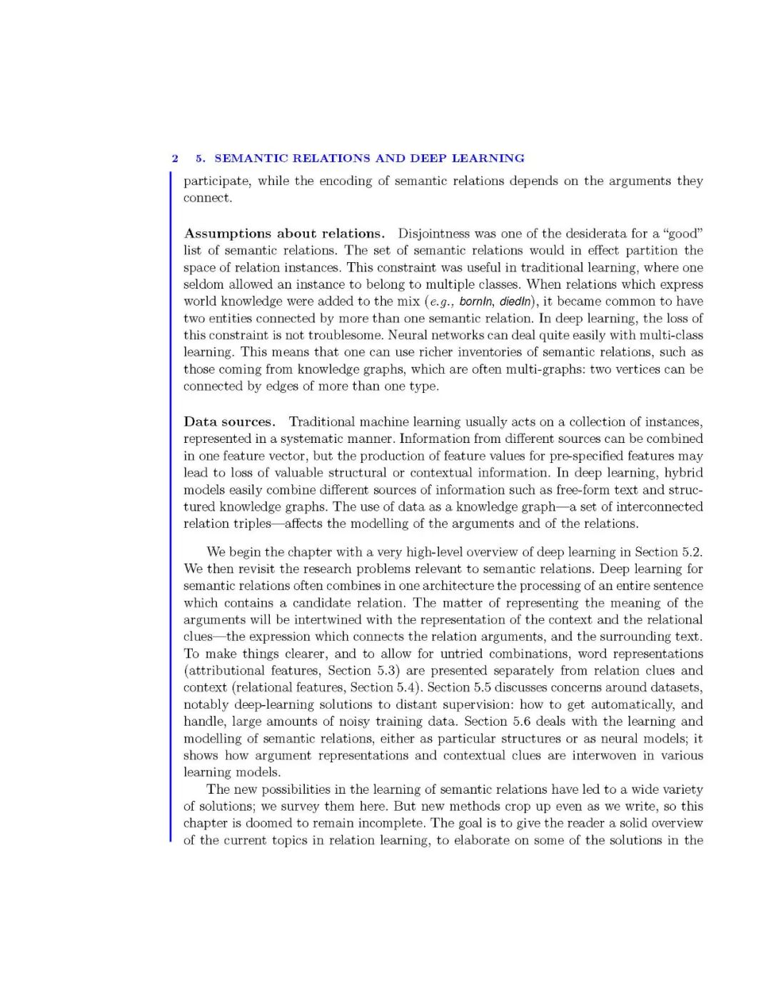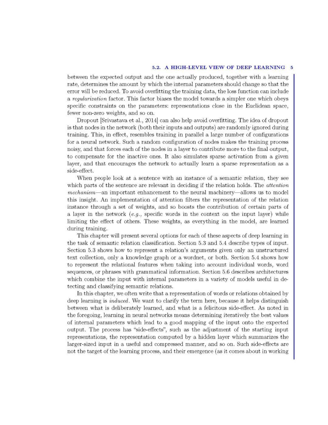 我们在5.2节以深度学习的高级概述开始本章。然后我们再回顾与语义关系相关的研究问题。语义关系的深度学习通常在一个体系结构中结合了对包含候选关系的整个句子的处理。论证的含义的表达将与上下文的表达和关系线索交织在一起——关系论证和周围的文本之间的表达。为了使事情更清楚,并允许未经尝试的组合,单词表示(属性特征,第5.3节)是分开的关系线索和上下文(关系特征,第5.4节)。第5.5节讨论了对数据集的关注,特别是对远程监督的深度学习解决方案:如何自动获取和处理大量有噪声的训练数据。第5.6节讨论语义关系的学习和建模,无论是作为特定结构还是作为神经模型;它展示了在不同的学习模式中,论点的表征和上下文线索是如何相互交织的。