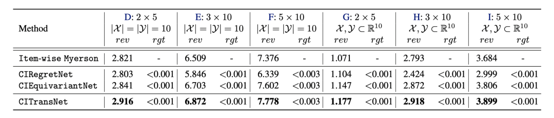 在机制模型设计上,我们设计了 CITransNet 网络结构,如图所示。我们的模型以买家报价、买家上下文与商品上下文这三种信息作为模型输入,先通过输入层来整合每个买家-商品对的报价与上下文信息,然后通过若干个基于 transformer 的交互层来建模所有买家-商品对之间的相互影响,最后通过一个输出层来计算分配结果与支付结果。