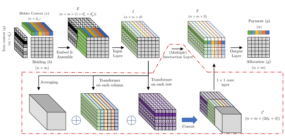 拍卖设计的一个核心问题是设计满足激励相容并最优化拍卖者期望收益的机制,然而理论的研究陷入了瓶颈。近年来,研究人员开始尝试使用深度学习方法寻找最优拍卖的近似解,这其中的开创工作是 RegretNet [1]。这一套方法论通过将拍卖设计问题抽象化为一个带限制优化问题,用神经网络来构建参数化的机制,并使用标准的机器学习方法来寻找近似最优解。尽管有一系列改进工作,然而目前这套方法论考虑的拍卖场景过于简单:拍卖场景通常限制在固定的买家集合与商品集合上 [1],或者限制在对称拍卖上[2]。