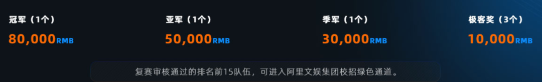 复赛审核通过的排名前 15 队伍,可进入阿里文娱集团校招绿色通道。