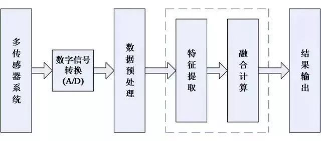 一般地,多源传感器数据融合处理过程包括六个步骤,如下图所示。首先是多源传感系统搭建与定标,进而采集数据并进行数字信号转换,再进行数据预处理和特征提取,接着是融合算法的计算分析,最后输出稳定的、更为充分的、一致性的目标特征信息。