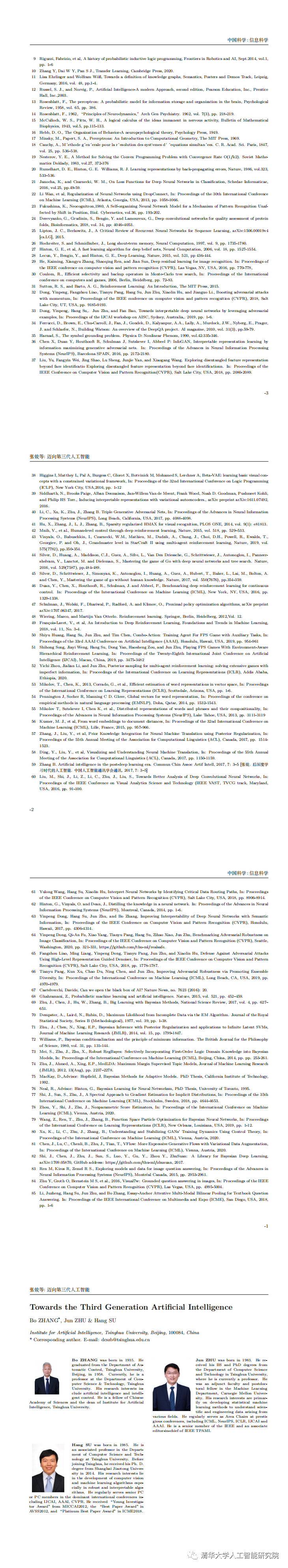 清华大学人工智能研究院院长、中国科学院院士张钹教授在“纪念《中国科学》创刊70周年专刊”上发表署名文章,首次全面阐述第三代人工智能的理念,提出第三代人工智能的发展路径是融合第一代的知识驱动和第二代的数据驱动的人工智能, 同时利用知识、数据、算法和算力等4个要素,建立新的可解释和鲁棒的AI理论与方法,发展安全,可信,可靠和可扩展的AI技术,这是发展AI的必经之路。