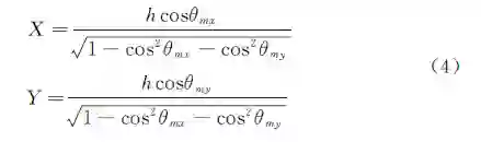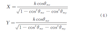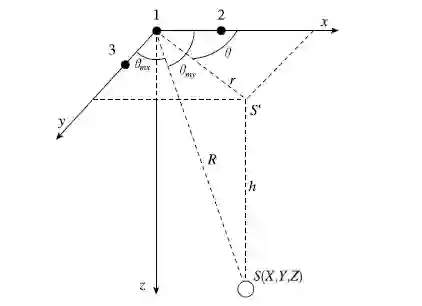 由于水平误差累计在垂直角计算过程中,因此高度方向误差较大,为了提高垂直角的测量,有些产品会在z轴方向也安装水听器,形成立体基阵,当然这样做又会导致基阵体积有所增大。此外,垂直角的测定受声速的影响特别大,因此更为直接的改善方法是在应答器中安装深度传感器获取深度h。理论上,仅通过水平角和深度也可以计算应答器位置,而且观测者并不需要知道发射时刻,而只需要被动接听即可,这样更容易工程实现,适用于某些无源定位的场合。其位置为: