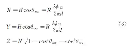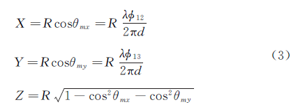 组成超短基线最少需要3个水听器,其中一个作为参考单元。若3个水听器位于2个相互垂直的基线上(x和y轴上),假设各方向上基元间距(基线)均为d,应答器发出的信号到基阵原点的声线与x轴及y轴的夹角分别为θmx和θmy(图6)。