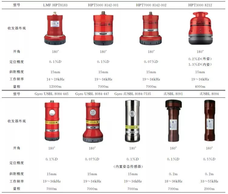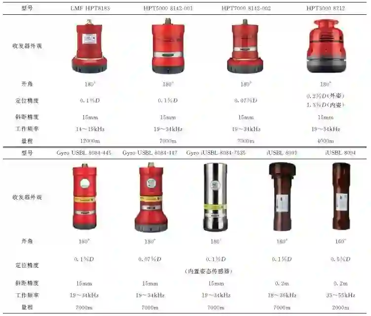 Ranger-USBL是该公司主打的一款中频系列,适用范围从浅水到深水均可。一代Ranger工作频段为18~36kHz,作用距离6000m。在使用单频信号的情况下斜距测量精度为0.2m,而在宽带信号工作条件下斜距测量精度可达到0.03m,定位精度为0.1%D。一代目前已退出市场,取而代之的是新一代的Ranger2和Mini-Ranger2,前者作用距离超过7000m,后者主要服务于1000m 内的近海区域。Ranger2系列中还有多款型号集成了内置姿态/惯性传感器,能够免校准输出高精度定位结果。此外,Ranger-USBL还使用了宽带技术,可以提供传输速率高达1500bit/s的水声通信服务。表4所示为Ranger2系列的多款声头性能参数。