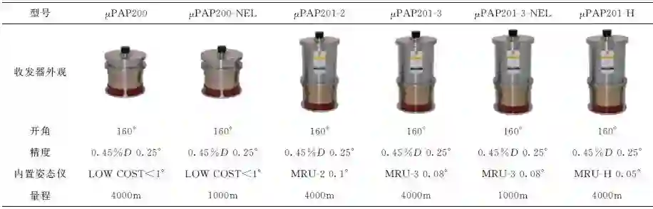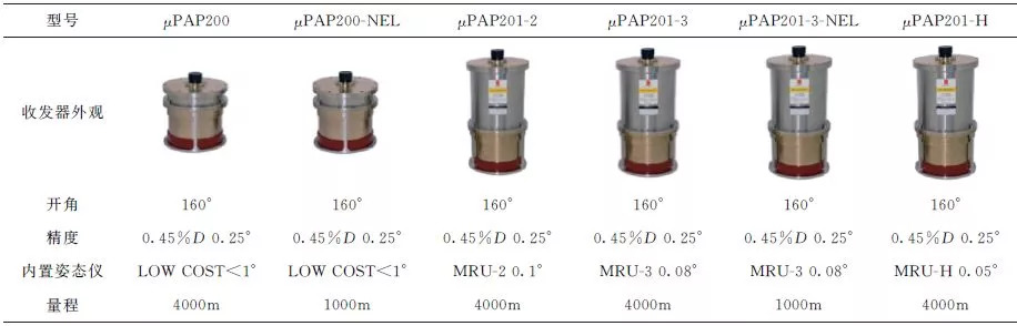 μPAP主要用于浅水领域,并且部分型号内置有姿态传感器,在售的换能器型号主要有μPAP200、μPAP200-NEL、μPAP201-2、μPAP201-3、μPAP201-3-NEL、μPAP201-H,性能参数如表3所示。