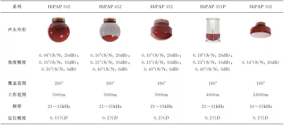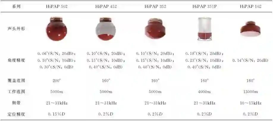 挪威Kongsberg公司于1996年开始推出第一代超短基线,新近推出的HiPAP700,作用水深达到了10000m,测距精度优于0.5m。目前在售的主要有HiPAP和μPAP这2个系列,HiPAP主要用于深水和海底勘测领域,主要包括HiPAP502、HiPAP452、HiPAP352、HiPAP351P-Series、HiPAP102五款型号,性能参数如表2所示,表中D 为斜距。多通道球面阵列是HiPAP系列的主要特征,其通道数量高达300个。这些探测通道选择性地开启,具有良好的波束指向性。