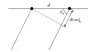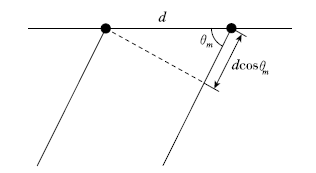 由于相对基元与应答器的距离,基阵尺寸极小,可认为入射到所有基元的声线平行。当信号频率为f0,即波长λ=c/f0 时,由图7可知,2个水听器接收信号的相位差ϕ与信号入射角θm的关系为: