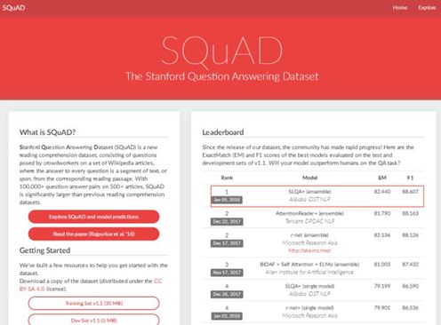 SQuAD比赛构建了一个大规模的机器阅读理解数据集(包含10万个问题),文章来源于500多篇维基百科文章。人工智能在阅读完数据集中的一篇短文之后,需要回答若干个基于文章内容的问题,然后与标准答案进行比对,得出精确匹配(Exact Match)和模糊匹配(F1-score)的结果。