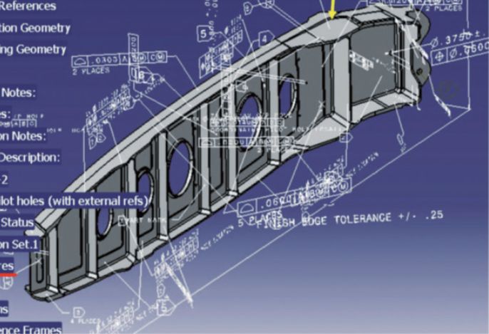 2)三维设计工具。三维设计工具较多,常见的有Pro/E、SolidWorks和CATIA等,其中以达索公司的CA⁃TIA最具代表性,是波音和中国航空工业使用的主流三维设计软件。在设计时,要在CATIA软件中生成零件的三维实体模型、零件结构的尺寸和公差标注等(图2)。除以上基本信息外,还应标注一些关键特征、零件的注释说明、加工工艺要求和装配连接定义等。在建模方面,CATIA提供了通用机械零件设计模块,航空钣金零件设计模块、复合材料设计模块、管路设计模块及电气系统设计模块等。