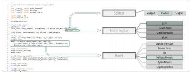 图 1:使用 DeepChem 进行基准评估的代码示例,提供多种方法用于数据分割、特征化和学习。