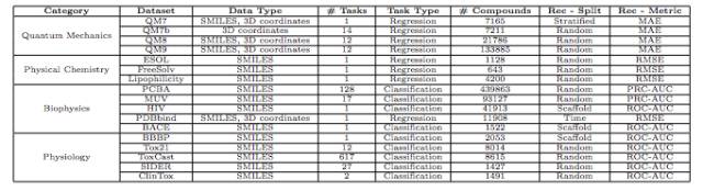 表 1:数据集细节:化合物和任务的数字、推荐的数据分割和度量。