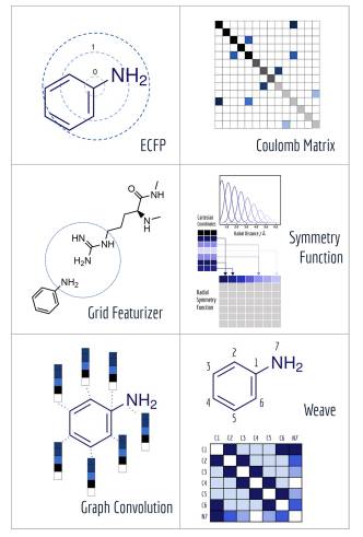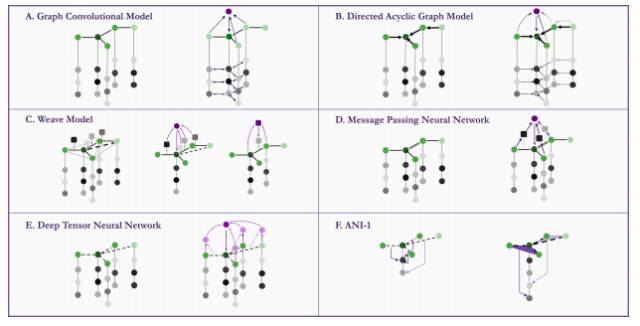 图 6:MoleculeNet 中实现的基于图的模型的核心结构。目的在于为中间的深绿色原子构建特征:A 图卷积模型(Graph Convolutional Model):特征通过邻近原子的连接进行更新;B 有向无环图模型(Directed Acyclic Graph Model):所有连接直接围绕中心原子,特征通过直接连接从最远的原子传送到中心原子;C Weave Model:每对原子(包括不直接连接的成对原子)都可以组对,中心原子的特征通过所有其他原子和相关的对进行更新,对特征通过组对的两个原子的连接进行更新;D 消息传递神经网络(Message Passing Neural Network):邻近原子的特征输入依赖连接类型的神经网络,再输出(消息)。中心原子的特征通过输出进行更新;E 深度张量神经网络(Deep Tensor Neural Network):没有明确的连接信息,特征通过其他原子对应的物理距离进行更新;F ANI-1:特征通过成对原子(径向对称函数)之间的距离信息和三个原子(角对称函数,angular symmetry function)之间的角度信息构建而成。