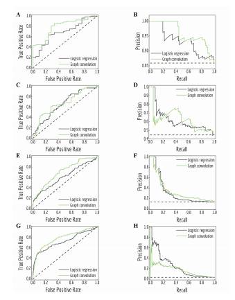 图 4:不同类别不均衡条件下,logistic 回归和图卷积模型预测的受试者工作特征(ROC)曲线和准确率-召回率曲线(PRC)。A、B:测试子集 ClinTox 中的「FDA APPROVED」任务;C、D:测试子集 SIDER 中的「Hepatobiliary disorders」任务;E、F:验证子集 Tox21 的「NR-ER」任务;G、H:测试子集 HIV 的「HIV active」任务。黑色虚线代表随机分类器的性能。
