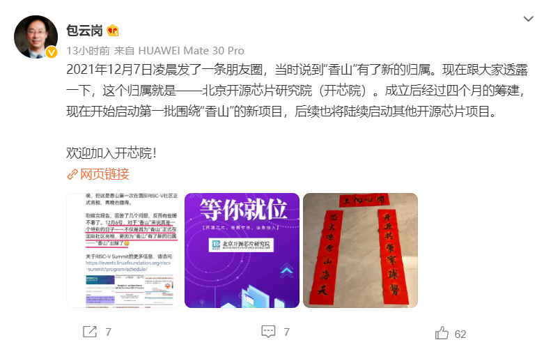 日前,中科院计算技术研究所副所长、RISC-V 国际基金会理事会成员包云岗透露,中科院 RISC-V 开源处理器“香山”有了新的归属——北京开源芯片研究院(开芯院)。包云岗表示,经过四个月的筹建,现已正式启动第一批围绕“香山”的新项目,后续也将陆续启动其他开源芯片项目。