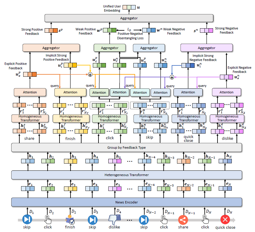 为了准确、有效地利用新闻平台上丰富的用户反馈,微软亚洲研究院的研究员们提出了一种基于多用户反馈的新闻推荐方法 FeedRec。图2展示了 FeedRec 中基于异构用户反馈的兴趣建模框架。研究员们分别利用同构和异构的 Transformer 来建模同类型与跨类型用户反馈之间的联系,并且提出了一种从强到弱的注意力机制,利用强反馈指导弱反馈的选择,从嘈杂的用户反馈中蒸馏出准确的正负反馈信号。对于得到的弱正反馈与弱负反馈,研究员们还利用了一个正则损失使得二者能被更好地区分。