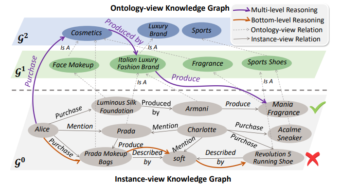 这种推理过程往往是在实体层知识图谱上进行的(instance-view KG)。如图5所示,实体层知识图谱只含有具体的实体及它们之间的关系(例如 Armani 生产了 Mania Fragrance),并不知道实体之间的高层关联(例如 Armani 和 Prada 都是意大利奢侈品牌)。因此在实体层的推理往往是碎片化的,不能综合用户的多种行为高屋建瓴地分析、推理。这就与分析时陷入细节、抓不住重点很类似。人类更智慧的推理过程往往是高屋建瓴,自顶而下,逐步考虑更多细节的。比如判断一个用户兴趣时,会先总结出 Alice 更喜欢化妆品,而不是球鞋,进而分析 Alice 可能喜欢的具体是属于意大利奢侈品牌的化妆品,从而进行一系列准确推荐。如果模型能借鉴这种高屋建瓴的能力,不仅可以让模型更快收敛到更好的结果,还可以提供令人信服的、概括用户更多行为的解释。