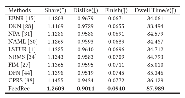 研究员们在一个从新闻 App 中收集的数据集上开展了实验。表1的结果显示 FeedRec 可以有效地提升多种点击率指标。表2进一步显示 FeedRec 可以提升多方面的用户黏性,更可能为用户推荐喜爱的新闻内容,改善用户的新闻阅读体验。