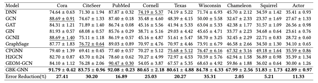 研究员们在具有不同同质异质特性的七个真实数据集上进行了广泛的实验。实验结果表明,与其他 SOTA 方法相比,GBK-GNN 有稳定且显著的提升。表3显示了不同模型在各个数据集上的分类准确率。