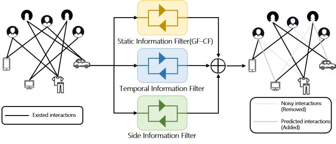 本文提出的 FIRE 是一个无参数的模型,不需要非常耗时的训练过程,因此在模型更新阶段具有非常高的效率。此外,借助图信号处理技术,研究员们还为 FIRE 设计了两个低通滤波器:时间信息滤波器和辅助信息滤波器,用于提升推荐结果的准确性。时间信息滤波器通过对用户交互数据进行指数衰减,用来捕捉用户随时间变化的偏好,而辅助信息滤波器则将辅助信息(如用户特征、物品属性)建模为用户或物品间的相似度信息,用于剔除存在于推荐结果的异常信息。这两个滤波器都实现了过滤用户交互信号中的高频分量保留低频分量的效果,使得用户交互信号更加平滑,从而保证推荐内容的准确和可靠。实验证明,FIRE 在保持高准确性推荐结果的同时,有着非常高的训练效率。