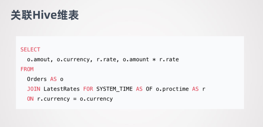 关联Hive维表采用了Flink的Temporal Table的语法,就是把Hive的维表作为Temporal Table,然后与流式的表进行join。想了解更多关于Temporal Table的内容,可查看Flink的官网。